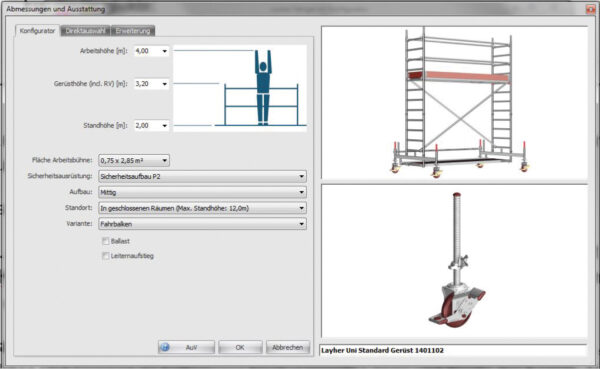 Za pomocą LayPLAN Rolling Tower-Configurator można szybko i łatwo wybrać standardowe rozwiązania rusztowań przejezdnych. Po wprowadzeniu wysokości roboczej, wymaganej przestrzeni roboczej i wybraniu opcji montażowej, program przedstawia ofertę rozwiązań wraz ze zdjęciami i listami materiałowymi.