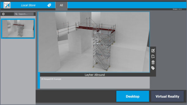 Bezpłatna przeglądarka LayPLAN VR Viewer umożliwia wirtualne zwiedzanie konstrukcji rusztowań, zapewniając realistyczne wrażenie przestrzenne. Dzięki temu jest to bardzo przydatne narzędzie, na przykład podczas koordynowania prac wykonywanych na placu budowy przez różne branże lub podczas oceny bezpieczeństwa pracy.