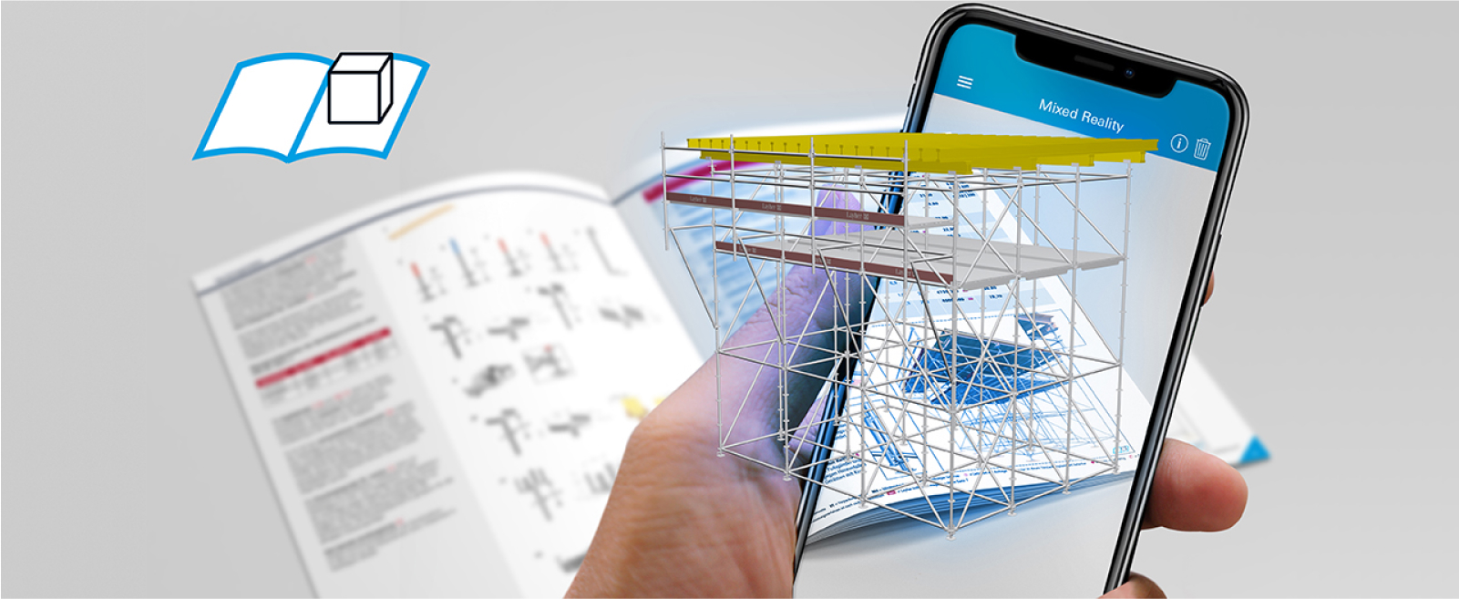 Mixed – Reality łączy prawdziwe ujęcia z kamery z cyfrowymi modelami rusztowań. W ten sposób rzeczywistość – tj. wszystkie rzeczy, które można zobaczyć – zostaje uzupełniona o dodatkowe informacje w postaci obiektów rusztowań 3D. Korzystając ze smartfona, cyfrowe elementy można zobaczyć w ich rzeczywistym otoczeniu, a katalogi Layher ożywają.